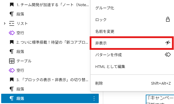 特定のブロックを削除することなく、一時的に非表示にできるようになりました。